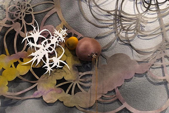 The works grow organically. The paper or fabric is stained and painted, then beginning with a shape, a cut, or a stitch, each new form responds to the ones that came before, replicating growth patterns as the marks slowly take over, spreading across the surface of the work.